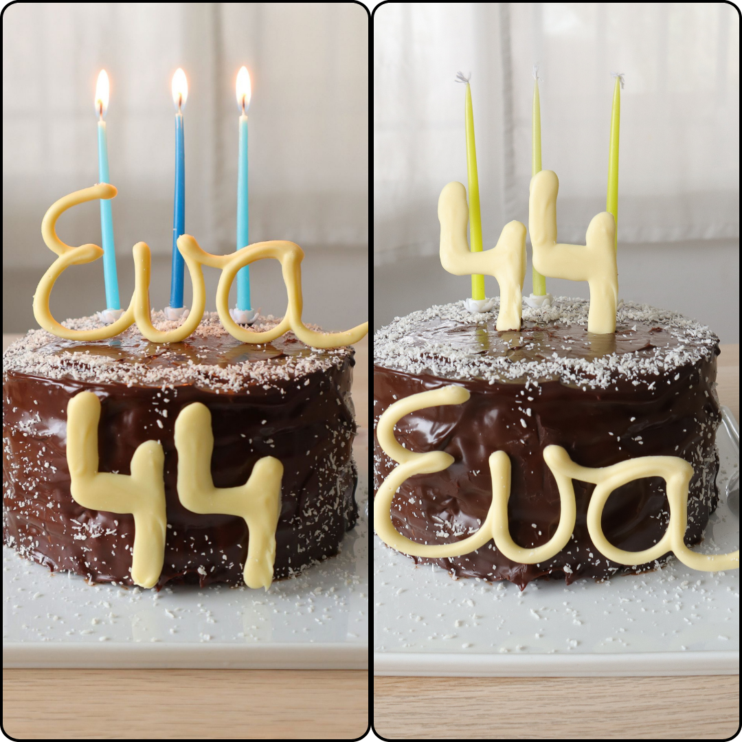 La decoración ya es totalmente personal. Aquí puedes ver dos. Primero hice la de la izquierda y no me terminaba de gustar, por lo que invertí la decoración, eso si, después de haber grabado, hacer las fotos y soplar las velas. Por lo que las velas también tuve que sustituirlas y volver a grabar y hacer las fotos jejejejeje